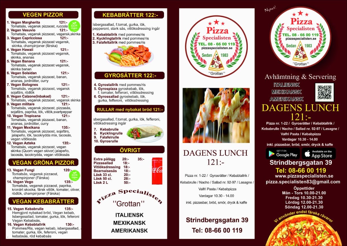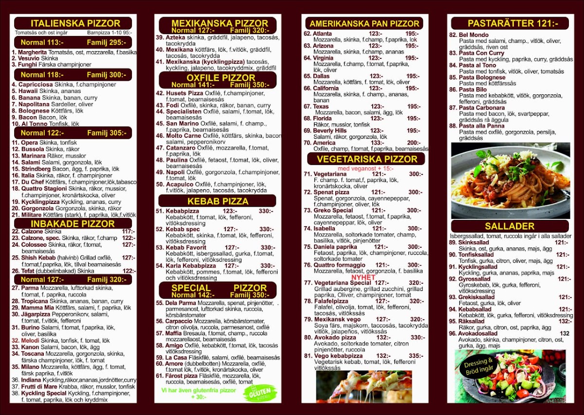 Pizza Specialisten Östermalm offers a diverse and flavorful menu, catering to a variety of tastes. Their Oxfilépizzor selection includes options like the Husets Pizza (Standard) and Husets Pizza (Glutenfri), perfect for those craving a classic pizza with a choice of gluten-free crust. For a more adventurous choice, try the Acapulco (Standard) or the Specialisten (Glutenfri). Pasta lovers can enjoy dishes such as Pasta Alla Panna, Pasta Con Curry, or the hearty Lasagne, while the Pasta Al Tonno and Pasta Bolognese remain solid favorites. The Kebabpizzor range includes the Kebabpizza Favorit (Standard) and Kebabpizza Special (Glutenfri), ideal for those seeking a spicier twist on traditional pizza. For a special treat, the La Casa (Glutenfri) and Amore (Standard) pizzas are perfect, with the option of gluten-free variations. The restaurant also serves up delicious Mexikanska Pizzor, like the Mexikanska (Standard) and the Azteka (Glutenfri). Vegetarians and vegans are well catered for, with options like the Vegan Hawaii (Glutenfri) and the Vegan Funghi (Standard) pizzas, as well as Vegan Kebabrulle and Vegan Kebabtallrik dishes. New items such as the Vegetariana Special and Avokadopizza add exciting variety to the menu. For a more filling experience, the Inbakade Pizzor, including the Calzone Special, provide a delicious, stuffed pizza alternative. Don't forget to complement your meal with a refreshing drink, such as Coca-Cola Zero 33 Cl or Fanta 2 Liter, and enjoy a side of Pizzasallad.